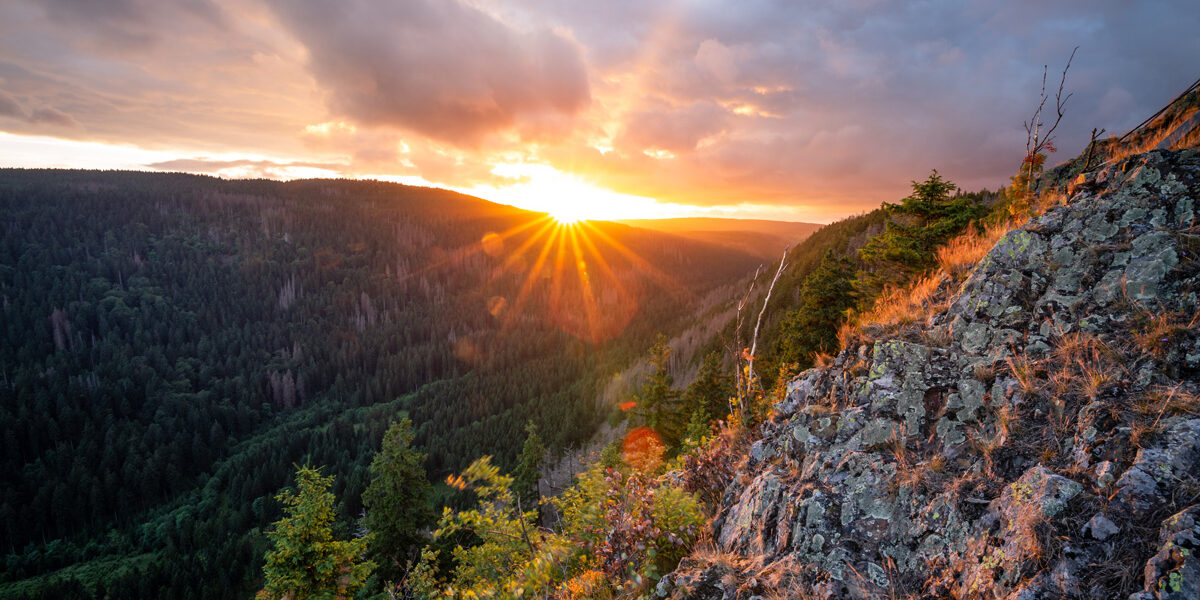 Während der Fahrt kam mir die Idee der Hahnenkleeklippen. Hier war ich zuletzt bei ungeeigneten Lichtverhältnissen. Idealerweise kann man beim Königskrug parken und wandert die knapp 2km bis zu Felsformation. Ich hatte das Gefühl spät dran zu sein und beeilte mich. An den Hahnenkleeklippen angekommen, packte ich meine Kamera und suchte einem geeigneten Spot. Die Sonne stand schon sehr niedrig und zeigte sich mit einem wahnsinnig schönen Licht.